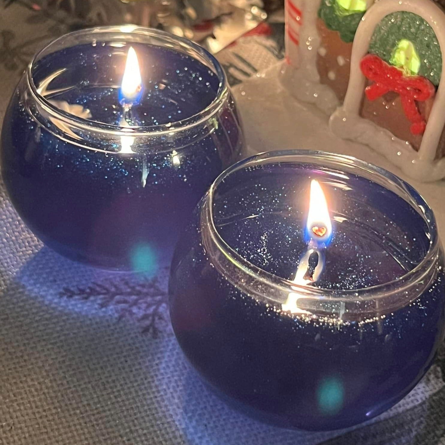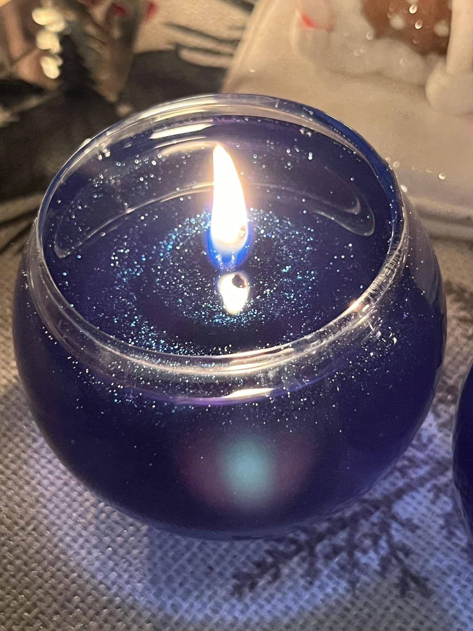 This listing is for one Dark Blue Glitter and Glow Candle scented with Candy Cane. It is approximately 2 1/2 inches tall and 3 inches wide. Never leave a candle unattended. Keep away from pets, children and anything flammable.